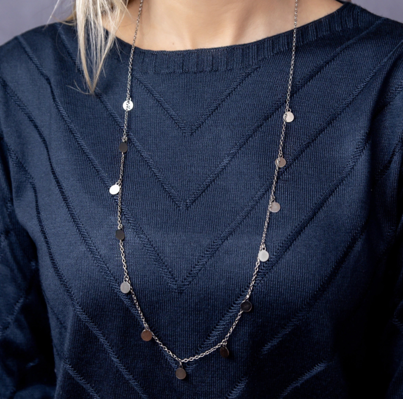 Colar longo em aço inox, com pequenas medalinhas em sua extensão.